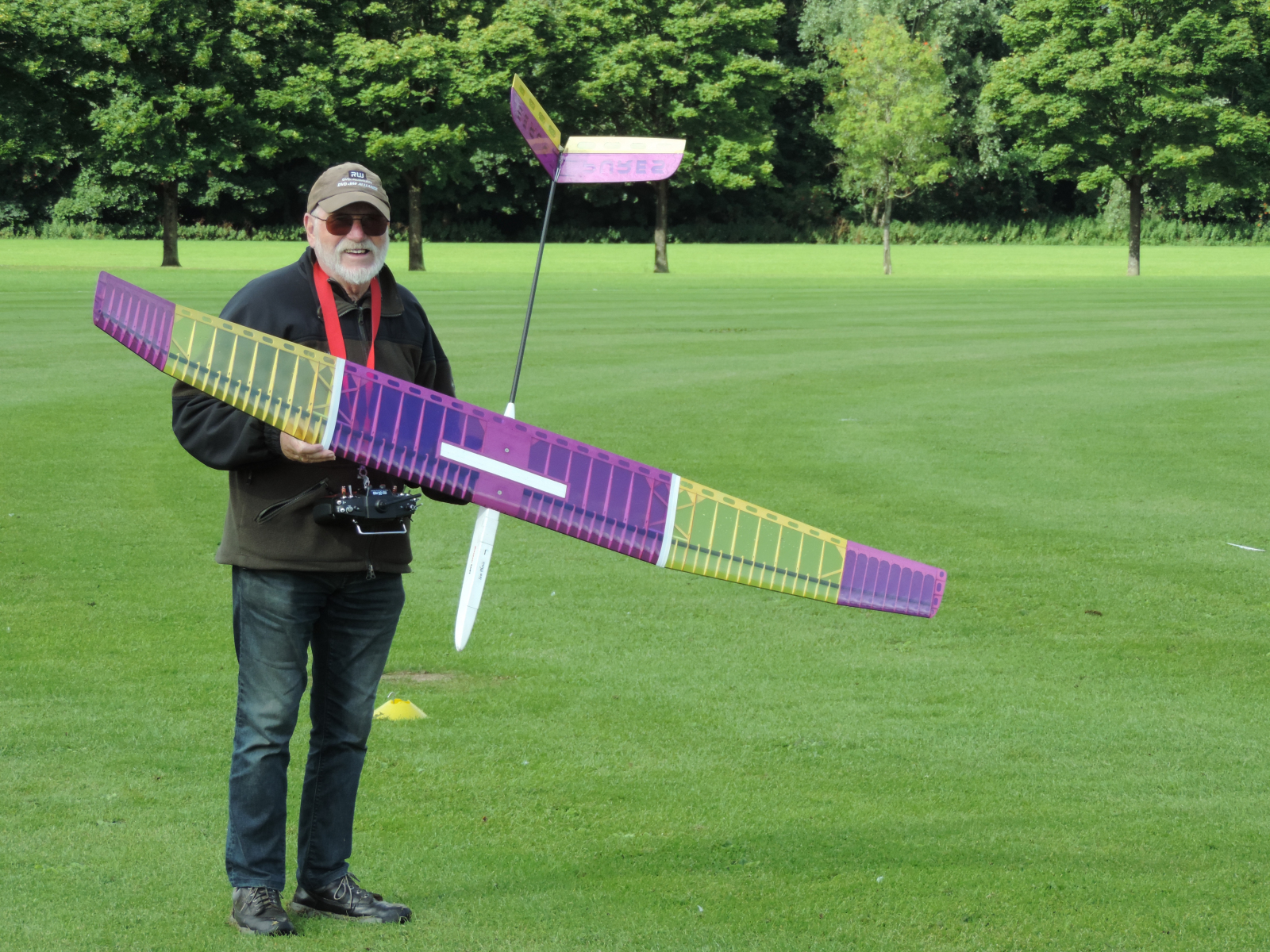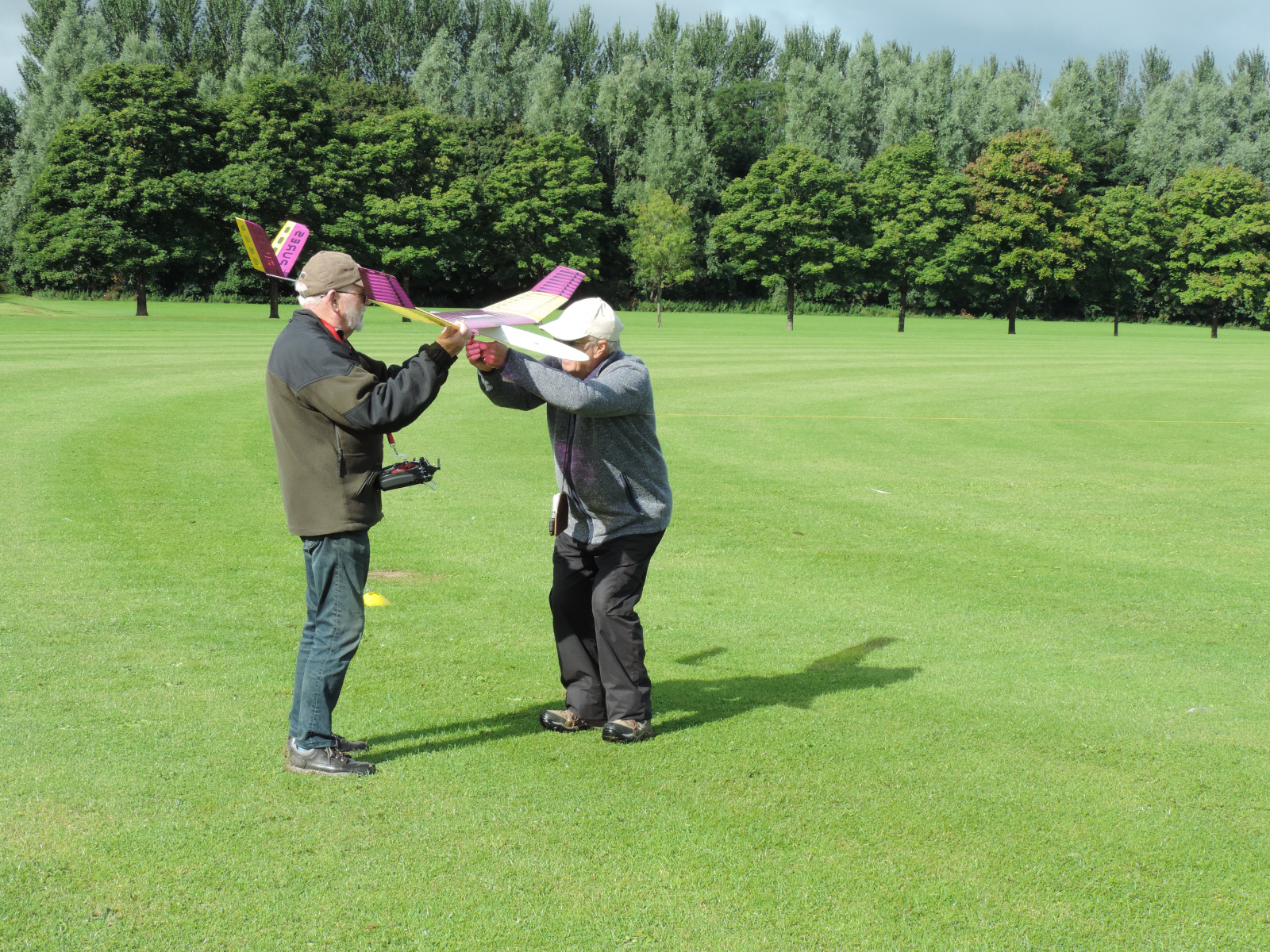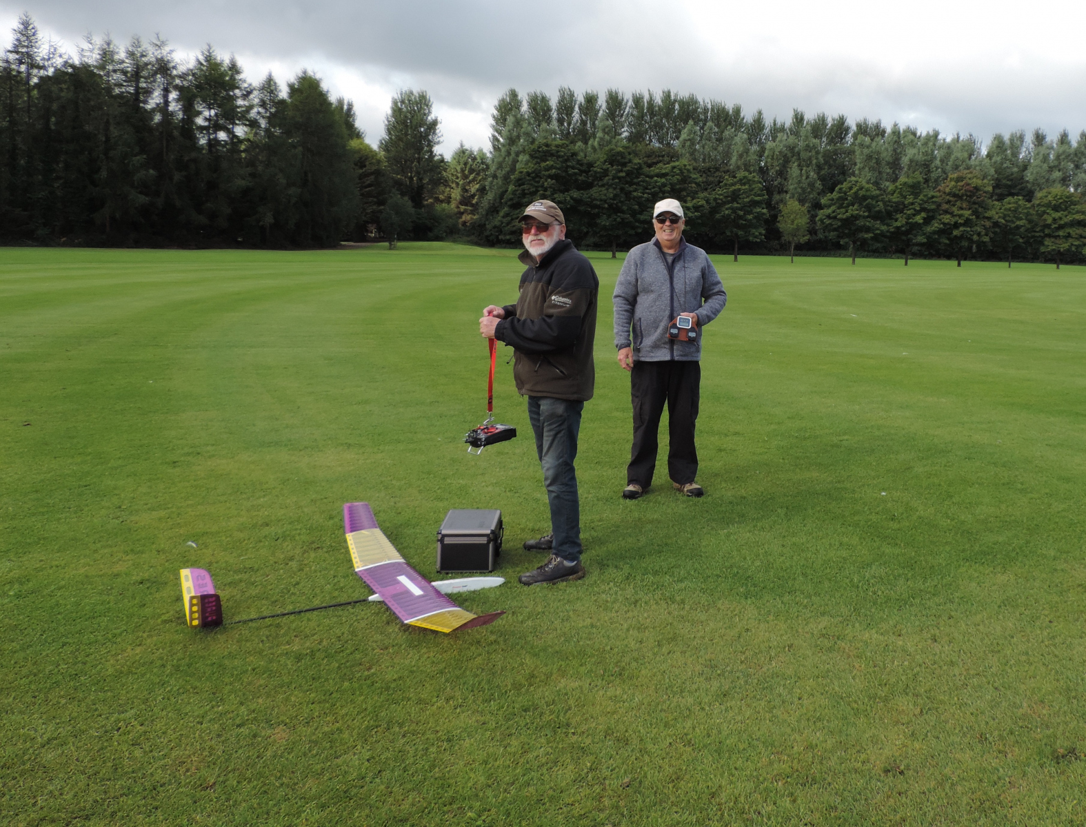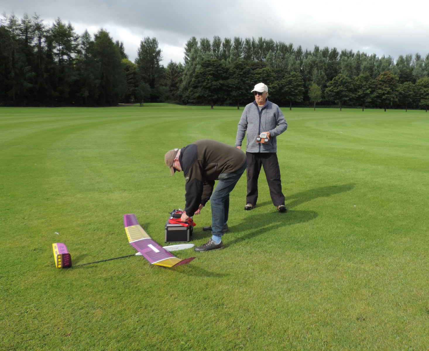 The day dawned windy, grey and cold. A typical August summers day!  We got off to a good start with the first round complete by 9.00am Flight times of four minutes plus were achieved though only one flyer managed to land on the spot. As the day went on our accuracy improved until most of us landed on the spot at will. The weather didn’t hold us back and we only paused for one shower of rain. Clear skies followed and we enjoyed the rest of the competition with good lift in places. Keith ran out the clear winner.
